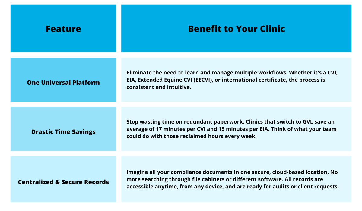 Many clinics use GVL for one specific need—like creating CVIs—while relying on other methods for their EIA tests or vice versa. This juggling act between different systems, paper forms, and digital platforms can create hidden inefficiencies. It leads to redundant data entry, scattered records, and the constant headache of managing multiple processes. It’s time to stop switching systems and consolidate your compliance documentation into a single, robust platform.